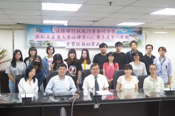 106年9月28日上午9時於法務部行政執行署新竹分署12樓會議室舉辦「本分署與私立玄奘大學法律系106年度第二學期學生實習服務始業典禮」,由林分署長佳裕主持,陳行政執行官靜怡、玄奘大學法律系王老師榮聖、黃老師瑞宜、正職人員代表、行政助理及實習同學共計18人參加,未來這一年將利用課程搭配實務的傳授,使同學們有效的學習且真正達到實習的效果。